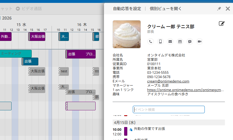 【プロファイルカード(連絡先情報)の表示方法について】 OnTimeはグループカレンダーという特性上、ユーザーやリソースの属性情報と密接に連携しています。それゆえそれらをまとめたプロファイルカード画面を準備しています。 メインビューでユーザー名や... -